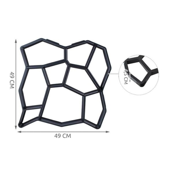 Το καλούπι είναι ιδανικό για να δημιουργήσετε διακοσμητικά μονοπάτια από σκυρόδεμα γύρω από το σπίτι ή στον κήπο. Το καλούπι, είναι κατασκευασμένο από πολυπροπυλένιο (PP), μπορεί να επαναχρησιμοποιηθεί και επιτρέπει τη δημιουργία “πλακόστρωτης πέτρας” με την έκχυση σκυροδέματος / χαλικιού / άμμου, με εξαιρετικά ελάχιστο κόστος υλικού.