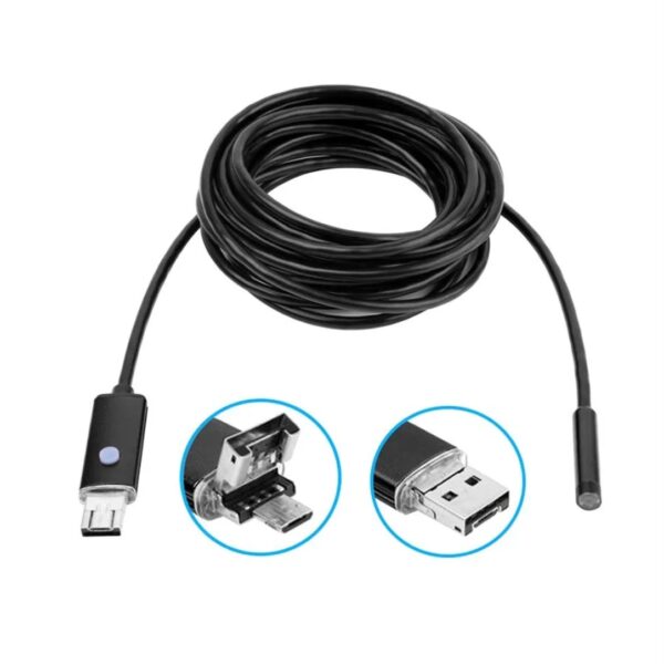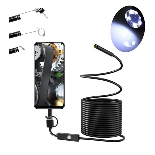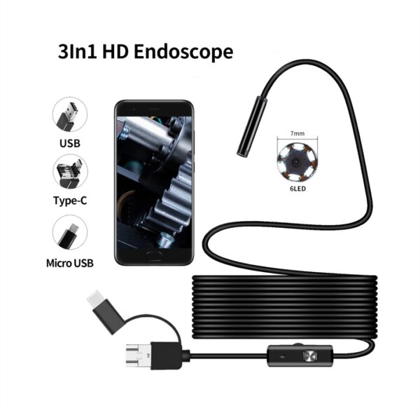 Αδιάβροχη ενδοσκοπική κάμερα με καλώδιο 5m. Μια κάμερα 3in1 διαθέτει USB, micro USB και Type-C. Συμβατό με Android και Windows. Αδιαβροχοποίηση IP67. Με 6 λευκά ενσωματωμένα LED. Ανάλυση 1280×720(0.8mm). Τροφοδοσία μέσω USB DC 5V.