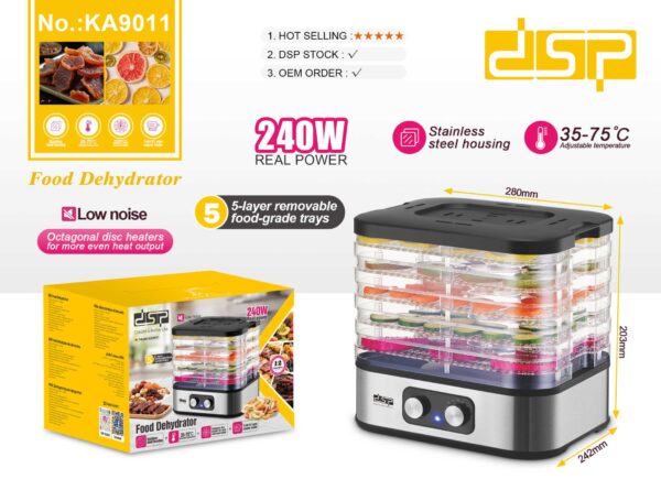 Αποξηραντής τροφίμων, υψηλής ποιότητας και απόδοσης, από την DSP. Διαθέτει 5 επίπεδα και είναι ιδιαίτερα εύχρηστος, ιδανικός για να αποξηράνεται φρούτα, λαχανικά, ζαρζαβατικά κα.