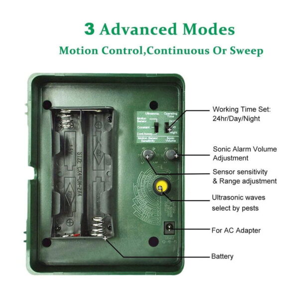 Μπορεί να απωθήσει παράγοντας δυνατούς υπέρηχους ή να τους συνδυάσει μαζί με δυνατούς συναγερμούς που θα τρομάξουν τα ζώα! Διαθέτει πολλές λειτουργίες ενεργοποίησης χάρη στον ανιχνευτή κίνησης που διαθέτει.