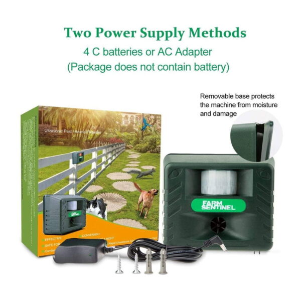 Υπέρηχοι: Οι υπέρηχοι, είναι ήχοι υψηλής συχνότητας, που γίνονται εντόνως αντιληπτοί από τα ζώα, ενώ οι άνθρωποι δεν μπορούν να τους ακούσουν. Ωστόσο, διαφορετικά ζώα, είναι ευαίσθητα σε διαφορετικές συχνότητες. Αυτή η συσκευή παράγει ισχυρούς υπερήχους. Διαθέτει ειδική ρύθμιση κατά την οποία μπορείτε να επιλέξετε την συχνότητα που θέλετε να εκπέμπετε ώστε να απωθείτε αποτελεσματικά κάθε ζώο. Πιο συγκεκριμένα διαθέτει επιλογές ανάμεσα σε έντομα, ελάφια, ρακούν, αρμαντίλλο, οπόσουμ, πουλιά, μεφίτες, σκυλιά / γάτες, τρωκτικά / νυχτερίδες και όλα τα ζώα της ίδια συνομοταξίας (αλεπούδες, κουνέλια, ποντίκια, σκίουρους κλπ)