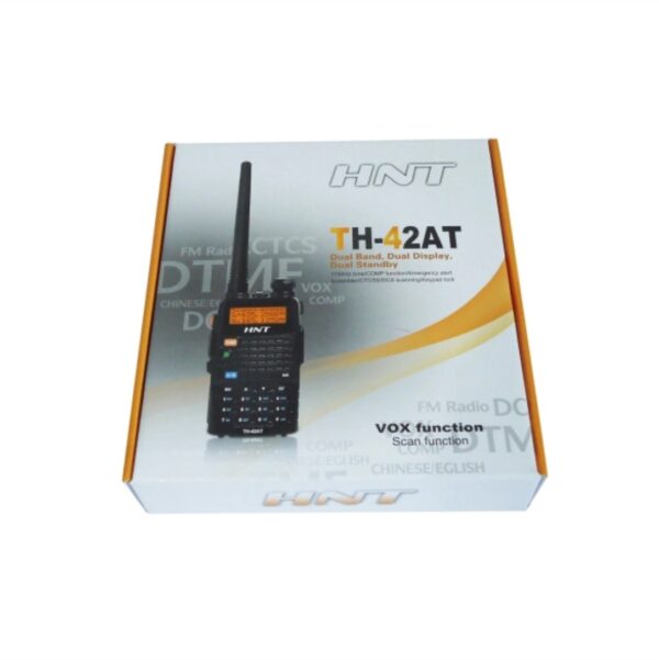 Ασύρματος πομποδέκτης HNT TH-42AT. Ισχύς 5W. Κατάλληλος για επαγγελματική χρήση. Επίσης διαθέτει και ραδιόφωνο FM. Είναι συμπαγές και φορητός για μεταφορά στην τσέπη. Εύρος συχνοτήτων 136-174 και 400-480MHz. Αριθμός μνημών 128 κανάλια. Σταθερότητα συχνότητας 2.5ppm. Η μπαταρία του είναι τύπου Lithium υψηλής χωρητικότητας που υπόσχεται μεγάλη αυτονομία και φορτίζει με τον αυτόματο επιτραπέζιο ταχυφορτιστή που συνοδεύει την συσκευή. Βήμα συντονισμού: 2.5/5/6.25/10/12.5/25KHzΣύνθετη αντίσταση κεραίας: 50ΩμΘερμοκρασία λειτουργίας: -20 °hC έως +60 °CΤροφοδοσία: Μπαταρία LiOn 7.4V / 1800mAHΚύκλος λειτουργίας: 3/3/54 λεπτά (Λήψη/Εκπομπή/Αναμονή)