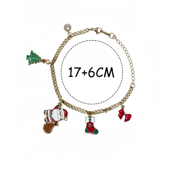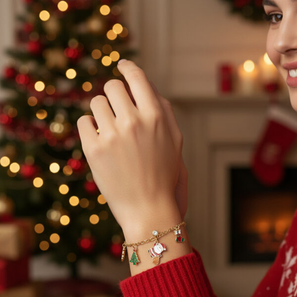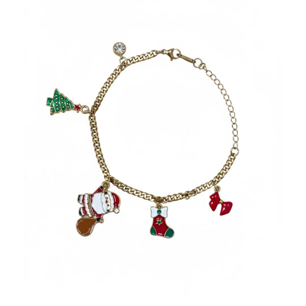 Εορταστικό ατσάλινο βραχιόλι με γιορτινά charms — Άγιο Βασίλη, χριστουγεννιάτικο δέντρο, κάλτσα και καμπανούλες. Ένα χαρούμενο και κομψό κόσμημα που θα συμπληρώσει ιδανικά τις γιορτινές σας εμφανίσεις. Κατασκευασμένο από ανοξείδωτο ατσάλι με πολύχρωμες λεπτομέρειες σμάλτου και λαμπερή χρυσή απόχρωση.