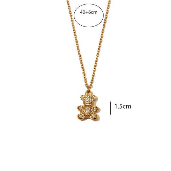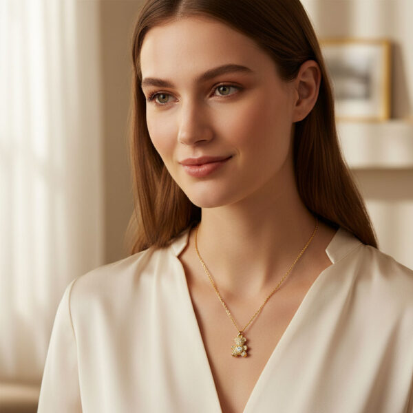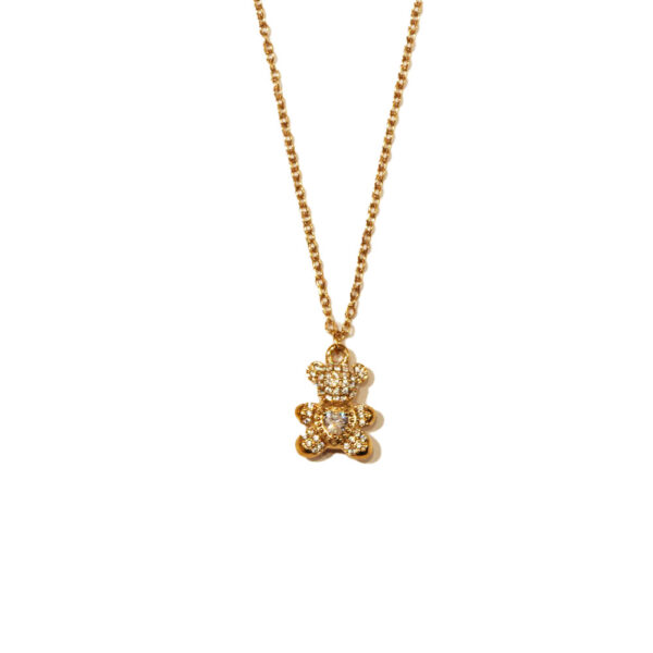 Λαμπερό κολιέ από ανοξείδωτο ατσάλι με μενταγιόν σε σχήμα αρκουδιού, στολισμένο με αστραφτερά ζιργκόν.Ένα χαριτωμένο και κομψό σχέδιο που συνδυάζει τη γλυκύτητα με τη λάμψη, ιδανικό για κάθε ηλικία και περίσταση.Διατίθεται σε χρυσό και ασημί χρώμα, προσφέροντας παιχνιδιάρικη κομψότητα σε κάθε εμφάνιση.