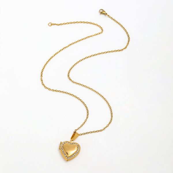 Εντυπωσιακό ατσάλινο κολιέ με μενταγιόν σε σχήμα καρδιάς που ανοίγει, ιδανικό για να φυλάξετε μέσα του μια μικρή φωτογραφία ή ένα αγαπημένο φυλαχτό. Η καρδιά διαθέτει λαμπερή επιφάνεια και διακόσμηση με λευκά στρας περιμετρικά, ενώ η χρυσή αλυσίδα προσφέρει κομψότητα και διαχρονικό στυλ. Κατασκευασμένο από ανοξείδωτο ατσάλι, ανθεκτικό και υποαλλεργικό.