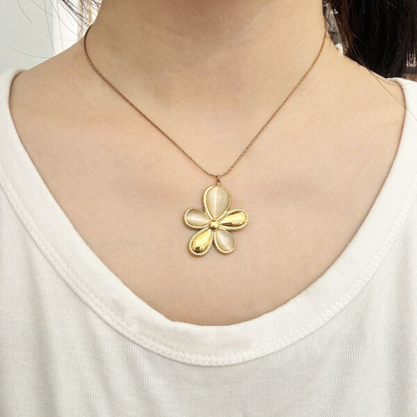 Κάνε τη διαφορά με αυτό το εντυπωσιακό ατσάλινο κολιέ, διακοσμημένο με ένα κομψό μενταγιόν σε σχήμα λουλουδιού. Οι λευκές λεπτομέρειες και η χρυσή λάμψη δημιουργούν ένα κομψό και ρομαντικό αποτέλεσμα, ιδανικό για καθημερινές ή πιο ιδιαίτερες εμφανίσεις. Κατασκευασμένο από ανοξείδωτο ατσάλι για αντοχή στον χρόνο και τη χρήση, διαθέτει ρυθμιζόμενο μήκος 40+5cm για τέλεια εφαρμογή.
