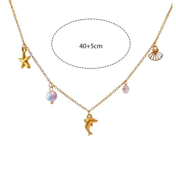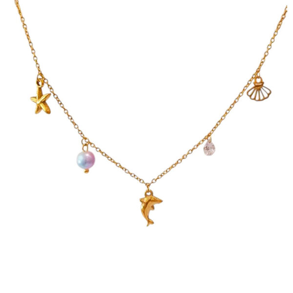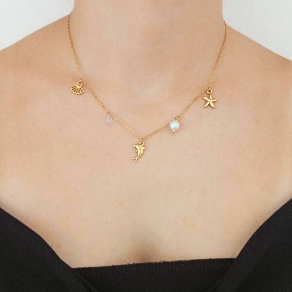 Καλοκαιρινό και παιχνιδιάρικο κολιέ από ανοξείδωτο ατσάλι, διακοσμημένο με χαριτωμένα charms: αστερία, δελφίνι, κοχύλι, λευκή περλίτσα και ένα διακριτικό στρασάκι που χαρίζει λάμψη. Ιδανικό για καθημερινές ή νησιώτικες εμφανίσεις, φοριέται εύκολα μόνο του ή σε συνδυασμό με άλλα κολιέ. Υποαλλεργικό, ανθεκτικό στο νερό και με ρυθμιζόμενο μήκος 40+5εκ για τέλεια εφαρμογή.
