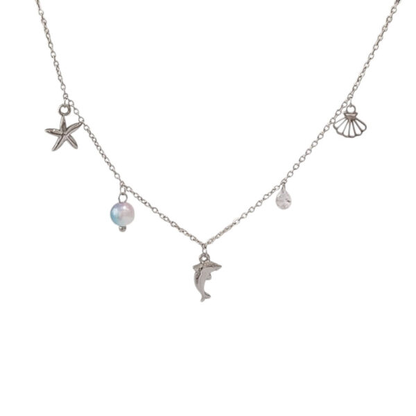 Ατσάλινο Κολιέ με Αστερία, Δελφίνι, Κοχύλι, Πέρλα & Στρασάκι – Ασημί