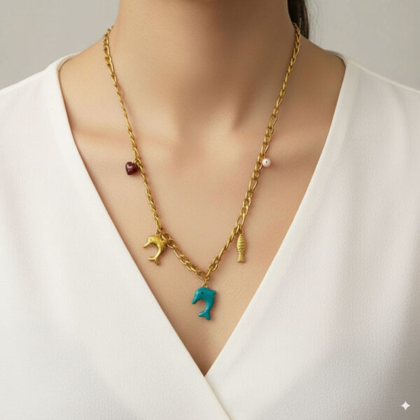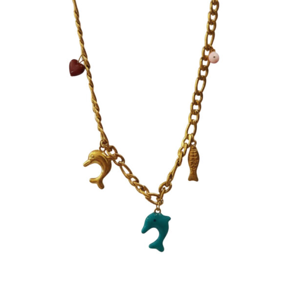 Ατσάλινο κολιέ με χρυσή αλυσίδα και κρεμαστά διακοσμητικά: τιρκουάζ δελφίνι, χρυσό δελφίνι, ψαράκι, μικρή καρδιά και ροζ χάντρα. Ένα παιχνιδιάρικο και καλοκαιρινό σχέδιο που συνδυάζει στυλ και φρεσκάδα. Μήκος αλυσίδας 40+6cm για άνετη εφαρμογή.