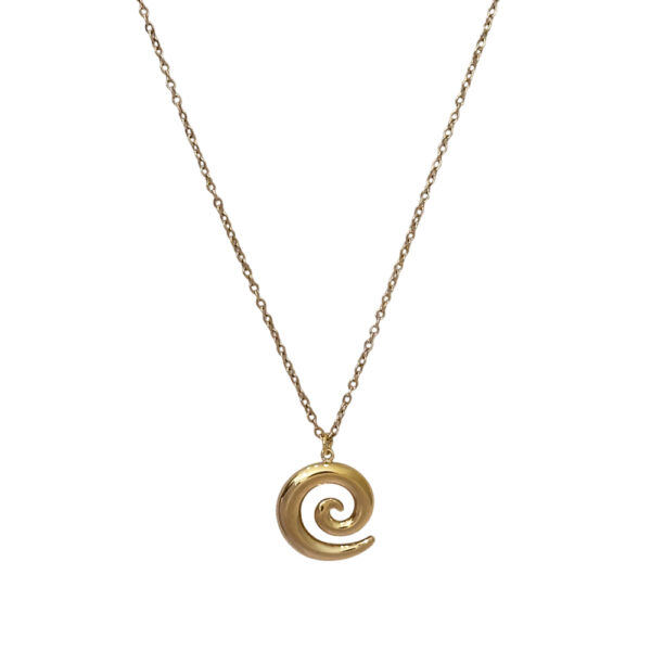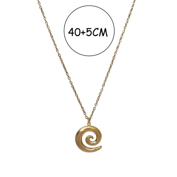 Κομψό ατσάλινο κολιέ με χρυσό μοτίφ σε σχήμα σπείρας. Ένα minimal και ταυτόχρονα εντυπωσιακό κόσμημα που συμβολίζει τη ροή και την αρμονία. Ιδανικό για να φορεθεί καθημερινά ή να συνδυαστεί με άλλα κοσμήματα για ένα πιο μοντέρνο look.