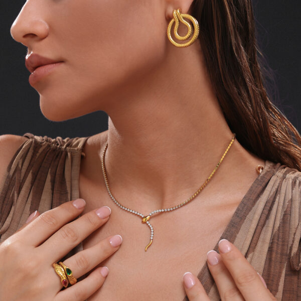Περιγραφή προϊόντος:Εντυπωσιακό ατσάλινο κολιέ τύπου choker με σχέδιο φίδι, διακοσμημένο με λαμπερά ζιργκόν σε όλο του το μήκος. Η elegant χρυσή απόχρωση και η ιδιαίτερη λεπτομέρεια του φιδιού δημιουργούν ένα statement κόσμημα που αποπνέει δυναμισμό και πολυτέλεια. Ιδανικό για βραδινές εμφανίσεις και glamorous looks.