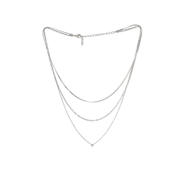 Ατσάλινο κολιέ με τρεις διαφορετικές αλυσίδες σε χρυσό ή ασημί χρώμα και διακριτικό κρεμαστό ζιργκόν. Ένα κομψό και μοντέρνο σχέδιο που χαρίζει layering εφέ σε κάθε εμφάνιση. Μήκος αλυσίδας 36+6cm για άνετη εφαρμογή.