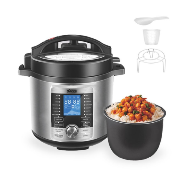 Χαρακτηριστικά: Υλικό: Ανοξείδωτο ατσάλι Χωρητικότητα: 6L Ισχύς: 1000W Τάση: 220-240V Συχνότητα: 50-60Hz, Ψηφιακή οθόνη LCD 17 προεπιλογές μαγειρέματος. Ρυθμιζόμενη θερμοκρασία και πίεση, Ενσωματωμένος οδηγός μαγειρέματος, Καπάκι με ασφάλεια κλειδώματος – Η λειτουργία δεν ξεκινά σε περίπτωση που δεν έχει τοποθετηθεί σωστά το καπάκι, Τεχνολογία εύκολης απελευθέρωσης-ανοίγματος, Αφαιρούμενο-πλενόμενο εσωτερικό δοχείο με ενισχυμένη αντικολλητική επίστρωση, Αφαιρούμενη βαλβίδα ατμού εύκολη στο καθάρισμα.