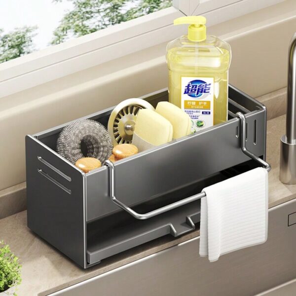 Βάση οργάνωσης νεροχύτη κουζίνας με θήκη για σαπούνι/σφουγγάρι και αξεσουάρ, με μεταλλική κρεμάστρα πανιού inox και βάση με ειδική δίοδο για την αποβολή του νερού στον νεροχύτη σας.