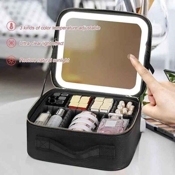 Η τσάντα καλλυντικών ταξιδιού είναι κατασκευασμένη από φιλικό προς το περιβάλλον συνθετικό δέρμα. Διαθέτει αποσπώμενα χωρίσματα και προσφέρει έναν τρίχρωμο καθρέφτη LED για το τέλειο μακιγιάζ σας. Είναι βολικό για μεταφορά και αποτελεί ιδανικό δώρο για τους λάτρεις της ομορφιάς.Κατάλληλο για οικιακή και ταξιδιωτική χρήση.