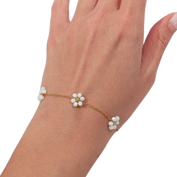 Ρομαντικό και κομψό βραχιόλι από ανοξείδωτο ατσάλι, διακοσμημένο με λευκά λουλούδια που χαρίζουν φρεσκάδα και διακριτική λάμψη. Διαθέτει αλυσίδα προέκτασης για ρύθμιση μεγέθους και κούμπωμα ασφαλείας. Ένα διαχρονικό αξεσουάρ που ταιριάζει σε κάθε στυλ και περίσταση, ιδανικό για καθημερινή χρήση αλλά και ως δώρο. 🌸