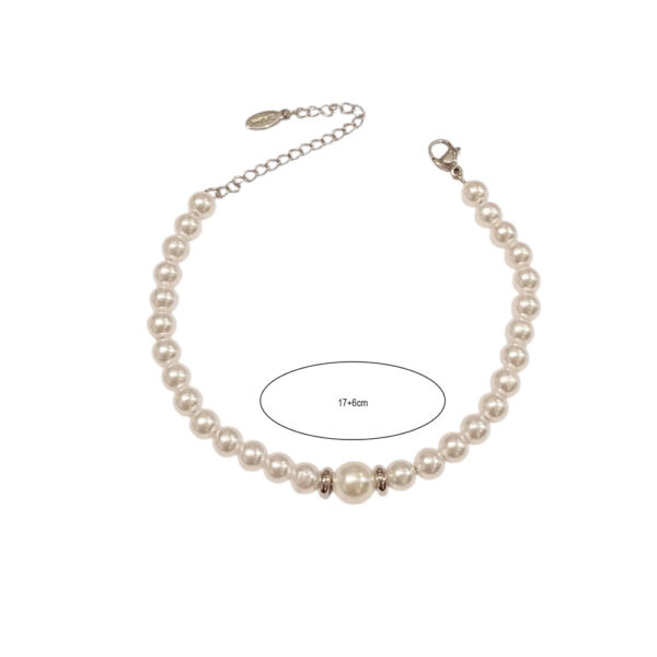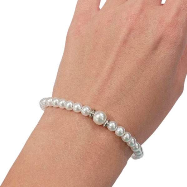 Κομψό βραχιόλι από λευκές μαργαριταρένιες χάντρες, στολισμένο με μεταλλικές λεπτομέρειες σε χρυσό ή ασημί χρώμα. Ιδανικό για να προσθέσει μια διαχρονική πινελιά κομψότητας σε κάθε εμφάνιση, είτε για καθημερινή χρήση είτε για ειδικές περιστάσεις.