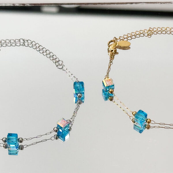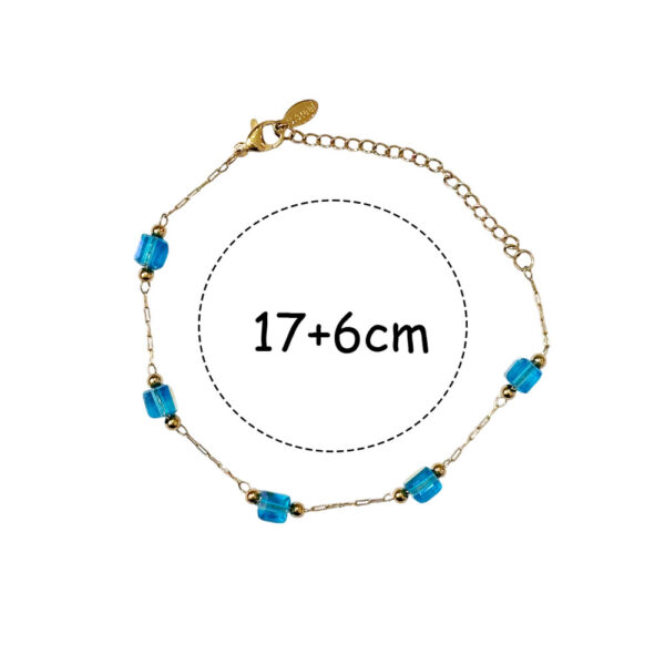 Κομψό και διακριτικό γυναικείο βραχιόλι με λεπτή ατσάλινη χρυσή αλυσίδα και κυβικές κρυστάλλινες χάντρες που προσθέτουν λάμψη και στυλ. Ιδανικό για καθημερινή χρήση αλλά και για πιο ιδιαίτερες εμφανίσεις.
