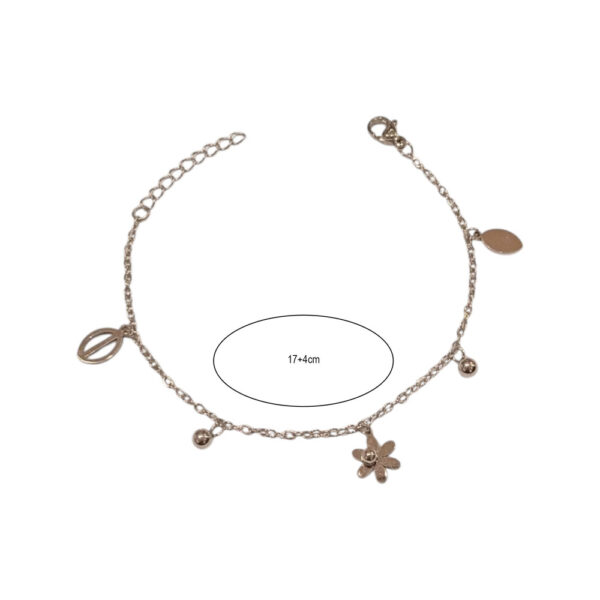 Ατσάλινο βραχιόλι με διακριτικά κρεμαστά στοιχεία: λουλούδι , φύλλο, στρογγυλές μπίλιες και αφηρημένο διακοσμητικό μοτίβο. Ένα ανάλαφρο, κομψό κόσμημα για καθημερινές αλλά και πιο ιδιαίτερες εμφανίσεις.Διατίθεται σε δύο χρώματα: χρυσό και ασημί.