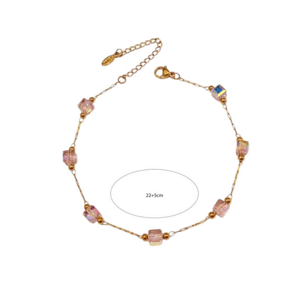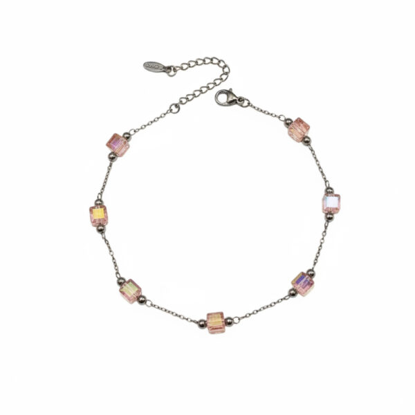 ανάλαφρο βραχιόλι ποδιού με λεπτή αλυσίδα και ροζ κυβικές γυάλινες χάντρες με διακριτική ιριδίζουσα λάμψη. διατίθεται σε χρυσό χρώμα και διαθέτει επέκταση για ρύθμιση μήκους. ιδανικό για girly καλοκαιρινές εμφανίσεις ή ως κομψό δώρο με ρομαντικό χαρακτήρα.