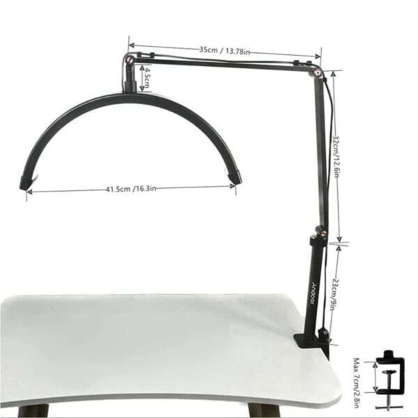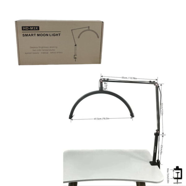 Το επαγγελματικό φωτιστικό σε σχήμα μισοφέγγαρου 3000K-6000K διαθέτει εργονομικό σχεδιασμό με ρυθμιζόμενο μεταλλικό σφιγκτήρα επιτραπέζιου φωτισμού βάσης και dimmer. Η κατασκευή με flexible σχήμα και πλήρη περιστροφή 360 μοίρες εξασφαλίζει τα μέγιστα αποτελέσματα στην περιοχή εργασίας και τον απόλυτο φωτισμό χωρίς σκοτεινά σημεία. Κυρτή σχεδίαση σε σχήμα μισοφέγγαρου (half moon) που μειώνει αποτελεσματικά τις σκιάσεις, ενώ παράλληλα προστατεύει τα ματιά από την υπερέκθεση. Είναι ιδανικό για eyelashes and brows experts, tattoo & nail artists, αισθητικούς, beauty salons αλλα και για όσους απαιτούν τον τέλειο φωτισμό.