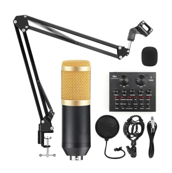 Σετ μικροφώνου και κάρτας ήχου, κατάλληλο για live streaming και μικρά studio για επαγγελματικές ηχογραφήσεις. Περιλαμβάνει μικρόφωνο, αντιανέμιο μικροφώνου, βραχίονες με διπλό στήριγμα, κάρτα ήχου V8. Ένας ολοκληρωμένος εξοπλισμός. Απόκριση συχνότητας 20Hz – 20kHz.