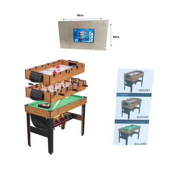 Το επιδαπέδιο τραπέζι πολλαπλών παιχνιδιών 3 σε 1 ήρθε για να συναρπάσει όλη την οικογένεια. Πληθώρα παιχνιδιών για δημιουργική απασχόληση μικρών και μεγάλων. Η εναλλαγή των παιχνιδιών είναι εύκολη και γρήγορη με απλή συναρμολόγηση. Το σετ περιλαμβάνει ποδοσφαιράκι , μπιλιάρδο ,χόκει Το προιόν περιέχει τα ακόλουθα εξαρτήματα΄. -2 μπάλες ποδοσφαίρου -2 στέκες μπιλιάρδου -1 σετ μπάλες μπιλιάρδου -1κιμωλίες -1 τρίγωνο – -2 δίσκους χόκει -2 πιόνια χόκει