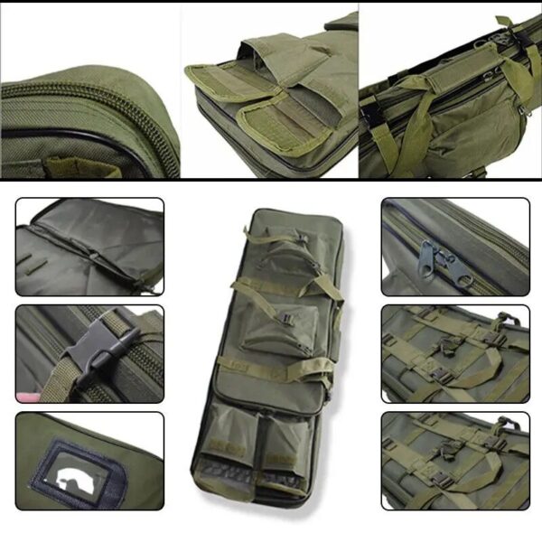 Επιχειρησιακή τσάντα/Θήκη όπλου κατασκευασμένη από έξτρα ενισχυμένο NYLON Oxford 600D υφάσμα με προστατευτικό σφουγγάρι στο εσωτερικό και βοηθητικές θήκες. Διαθέτει: Εσωτερική θήκη με μαλακά προστατευτικά και διπλό φερμουάρ, Χειρολαβές μεταφοράς με προστατευτικό κάλυμμα, Λουριά σακιδίου πλάτης με μαξιλαράκια, 5 εξωτερικες θήκες. Διαστάσεις: 118 x 28 x 12cm.
