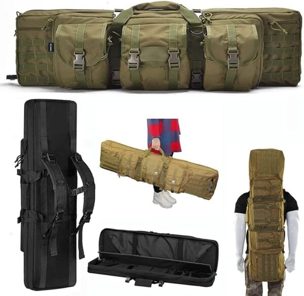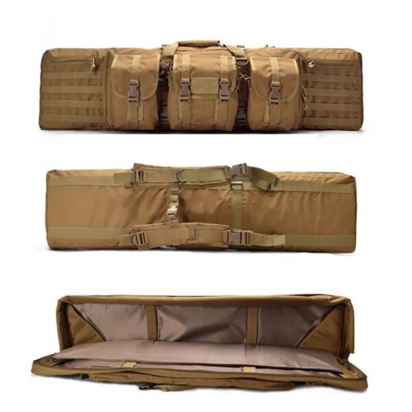 Επιχειρησιακή τσάντα/Θήκη όπλου κατασκευασμένη από έξτρα ενισχυμένο NYLON Oxford 600D υφάσμα με προστατευτικό σφουγγάρι στο εσωτερικό και βοηθητικές θήκες. Διαθέτει: Εσωτερική θήκη με μαλακά προστατευτικά, λάστιχα συγκράτησης και διπλό φερμουάρ, Χειρολαβές μεταφοράς με προστατευτικό κάλυμμα, Λουριά σακιδίου πλάτης με μαξιλαράκια, 6 εξωτερικες θήκες – 3 με κλιπς & velcro/3 με φερμουάρ. Διαστάσεις: 108 x 30 x 17cm.