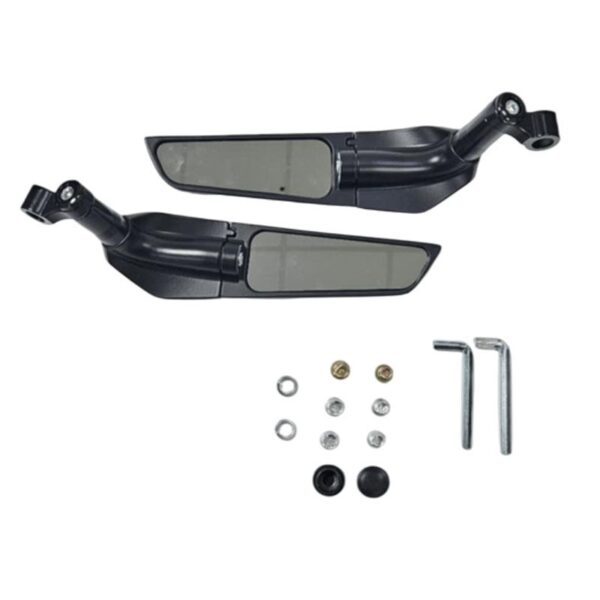 Το σετ περιλαμβάνει δύο καθρέπτες μηχανής σε ορθογώνιο σχήμα, σε κομψό μαύρο χρώμα, ιδανικούς για βελτίωση της ορατότητας και της ασφάλειας κατά την οδήγηση. Κατασκευασμένοι από ανθεκτικά υλικά, προσφέρουν σταθερότητα και μακροχρόνια χρήση.