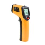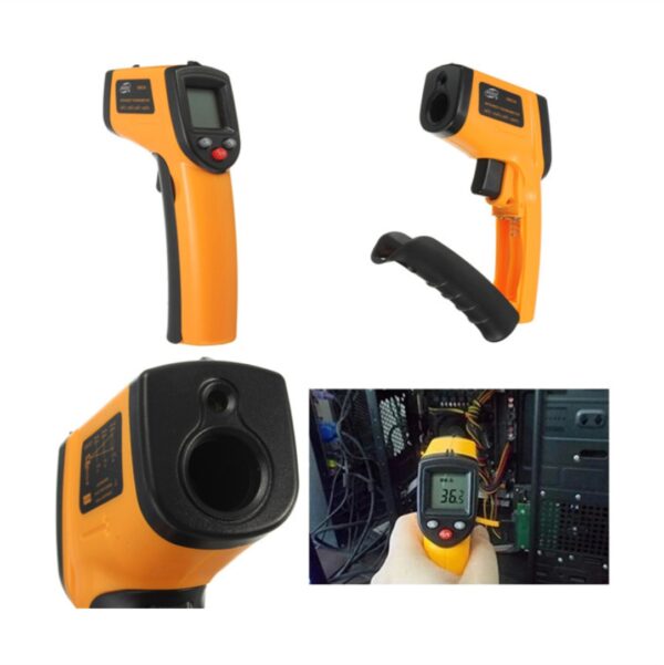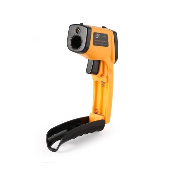 Ψηφιακό θερμόμετρο. Μέτρηση θερμοκρασίας μέχρι 400℃. Αναλογία απόστασης 12:1. Δυνατότητα κράτησης δεδομένων θερμοκρασίας. Διαθέτει LCD οθόνη. Λειτουργεί με 2 μπαταρίες ΑΑΑ, περιλαμβάνονται. Διαστάσεις 14×8.5×3.5cm.