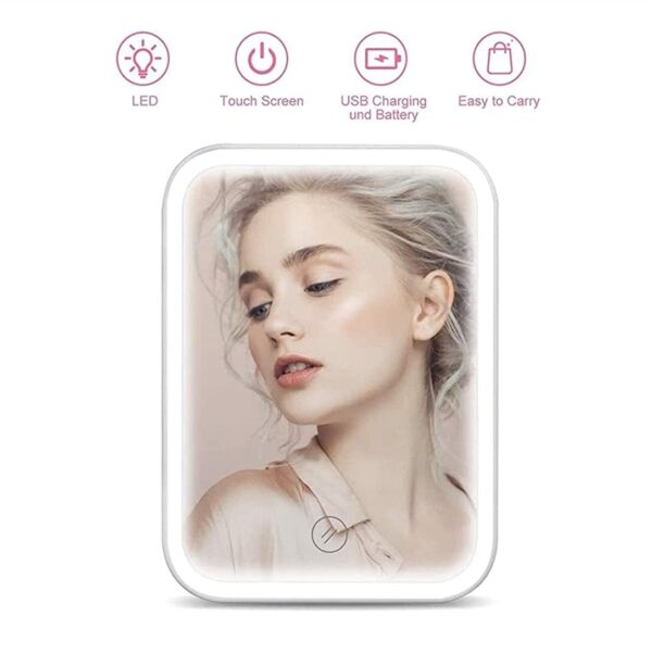 Καθρέφτης μακιγιάζ για επαγγελματικό αποτέλεσμα. Ιδανικός για να περιποιηθείτε το πρόσωπό σας. Διαθέτει κουμπί αφής touch για άνοιγμα πατώντας απλά το κουμπί στην οθόνη. Διαστάσεις 13,5x18x2cm. Διαθέτει καλώδιο USB για την φόρτιση. Υλικό ABS. Φωτεινότητα 6500K white light.