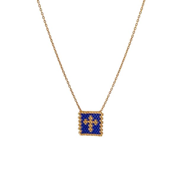 Κομψό κολιέ από ανοξείδωτο ατσάλι με χειροποίητο μοτίφ σταυρού φτιαγμένο από χάντρες Miyuki. Ένα διακριτικό και διαχρονικό κόσμημα που συνδυάζει μίνιμαλ αισθητική με πνευματικό συμβολισμό. Ιδανικό για καθημερινή χρήση αλλά και ως ένα ξεχωριστό δώρο με νόημα. Διατίθεται σε μαύρο, μπλε, τυρκουάζ και λευκό χρώμα.