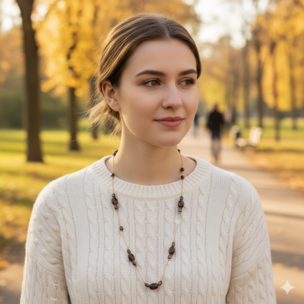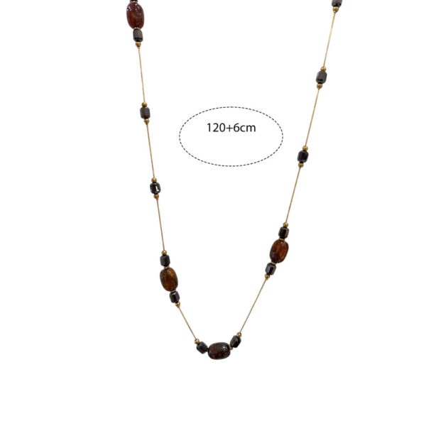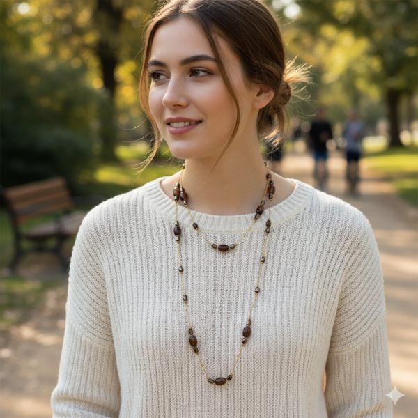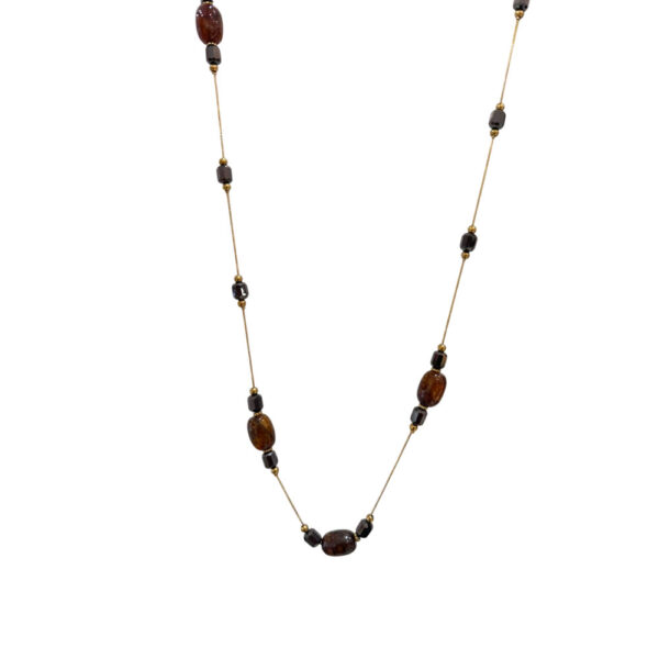 Κομψό μακρύ κολιέ με καφέ και μαύρες χάντρες σε διαφορετικά σχήματα, δεμένες σε λεπτή χρυσή αλυσίδα. Ένα διακριτικό αλλά εντυπωσιακό κομμάτι που μπορεί να φορεθεί μόνο του ή συνδυαστικά με άλλα κολιέ για layering.Ιδανικό για καθημερινό στυλ αλλά και πιο σοφιστικέ εμφανίσεις.