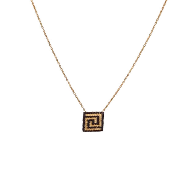 Κομψό κολιέ από ανοξείδωτο ατσάλι με τετράγωνο μαίανδρο από μακραμέ σε μαύρο, μπλε ή λευκό χρώμα. Ένα ιδιαίτερο και διαχρονικό κόσμημα που συνδυάζει την ελληνική παράδοση με το σύγχρονο στυλ. Ιδανικό για καθημερινή χρήση αλλά και για να δώσει ξεχωριστή πινελιά στις πιο κομψές σας εμφανίσεις.