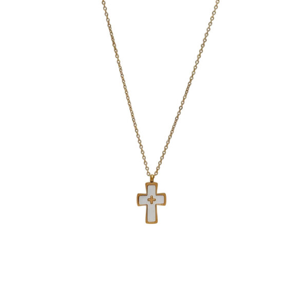 Κομψό κολιέ με σταυρό από ανθεκτικό ατσάλι, ιδανικό για καθημερινή χρήση ή ως διακριτικό σύμβολο πίστης. Ο σταυρός διαθέτει γυαλιστερή επιφάνεια από φίλντισι σε ροζ ή λευκή απόχρωση, προσδίδοντας διακριτική λάμψη και κομψότητα.Το ατσάλι εξασφαλίζει ανθεκτικότητα στον χρόνο και δεν μαυρίζει, ενώ η αλυσίδα εφαρμόζει όμορφα στον λαιμό, αναδεικνύοντας το μενταγιόν.Ιδανικό δώρο για κάθε περίσταση.