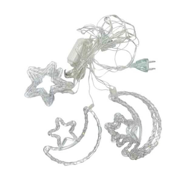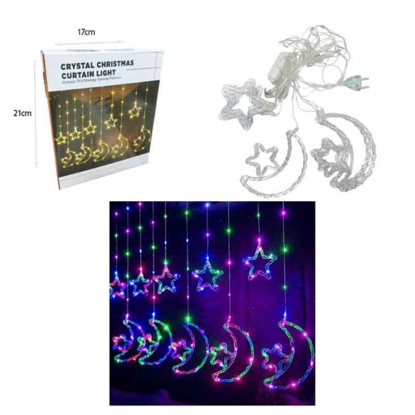 Κουρτίνα φωτισμού μήκους 3 μέτρων με Πολύχρωμο φωτισμό και 10 LED σε σχέδιο αστεριών και φεγγαριών. Δημιουργεί μια μαγική και εορταστική ατμόσφαιρα για τα Χριστούγεννα, ιδανική για παράθυρα, τοίχους ή βιτρίνες. Εύκολη στην τοποθέτηση και οικονομική στην κατανάλωση ρεύματος.