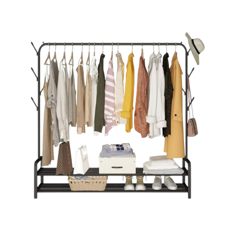 Kρεμάστρα δαπέδου μονή, μεταλλική, με ράφι παπουτσιών και πλαϊνές κρεμάστρες, ιδανική ως έπιπλο εισόδου ή για την οργάνωση των ρούχων στο δωμάτιό σας.