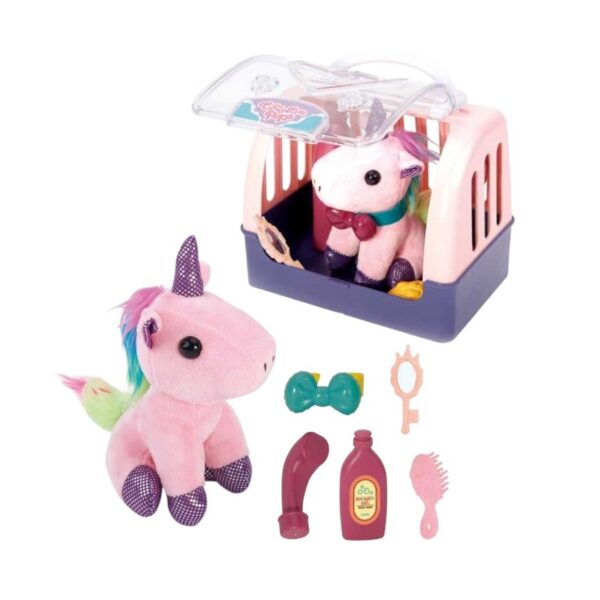 Λούτρινο ζωάκι μονόκερος με πλήρες σετ αξεσουάρ περιποίησης και φροντίδας και με υπέροχο σπιτάκι-τσαντάκι μεταφοράς για να το έχεις παντού μαζί σου.