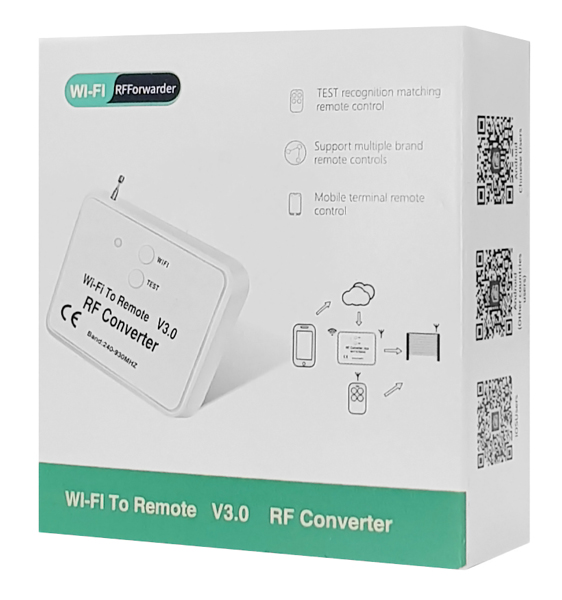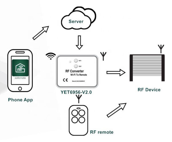 Με τον μετατροπέας wifi σε RF, χωρίς αλλαγή του receiver/controller RF, μπορείτε εύκολα να ρυθμίσετε τη συσκευή RF να ελέγχεται μεσω εφαρμογής WIFI για κινητά (παραδείγματα συσκευών RF: χειριστήρια πόρτας γκαράζ, χειριστήρια πύλης, προϊόντα ασφαλείας, rf έλεγχος φωτός κ.λπ.).