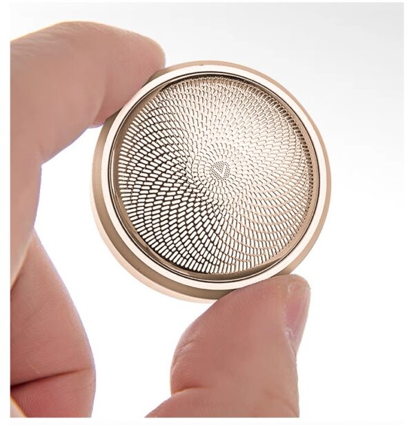 Επαναφορτιζόμενη ξυριστική μηχανή με στρογγυλή κεφαλή και πρωτοποριακό μεταλλικό σχεδιασμό με ανάγλυφα σχέδια.