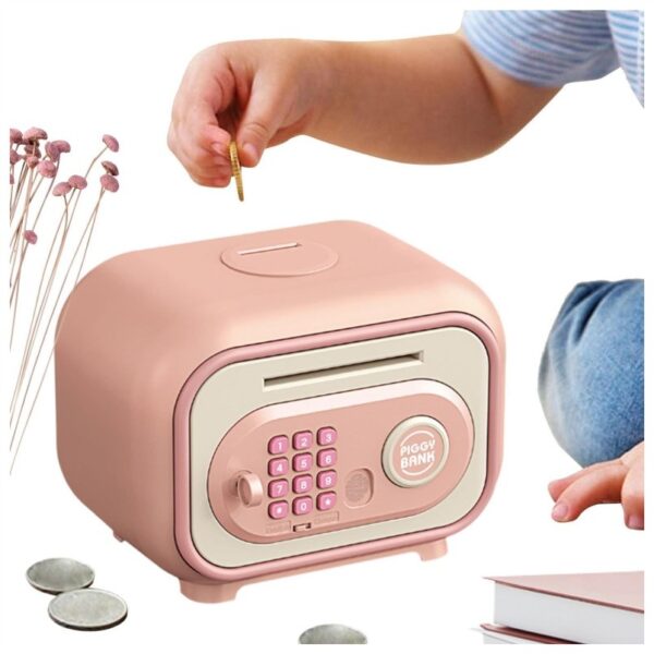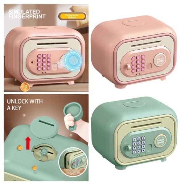 Ο παιδικός κουμπαράς με κλειδαριά κωδικού είναι μια χαριτωμένη συσκευή για την αποθήκευση των αποταμιεύσεων του παιδιού σας. Δακτυλικό αποτύπωμα, μουσική, ήχος και κλειδί για άνοιγμα κουμπαρά/χρηματοκιβώτιο – όλα αυτά περιλαμβάνουν έναν ηλεκτρονικό κουμπαρά για παιδιά που μοιάζει με τερματικό τράπεζας. Ο κουμπαράς έχει υποδοχή τόσο για χαρτονομίσματα όσο και για κέρματα. Το κουμπί δακτυλικών αποτυπωμάτων αντιδρά όταν το αγγίζετε με το δάχτυλό σας, μετά από αυτό ανάβει μια δίοδος, που θυμίζει κάμερα σάρωσης προσώπου.