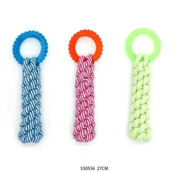 Παιχνίδι σκύλου σχοινί με κόμπους και κρίκο μασητικό, από ανθεκτικό, μη τοξικό πολυεστέρα, ιδανικό για παιχνίδια τραβήγματος/αντίστασης ενώ παράλληλα βοηθά στην υγιεινή στόματος του σκύλου σας καθώς καθαρίζει ήπια και απασχολεί τα δόντια του.