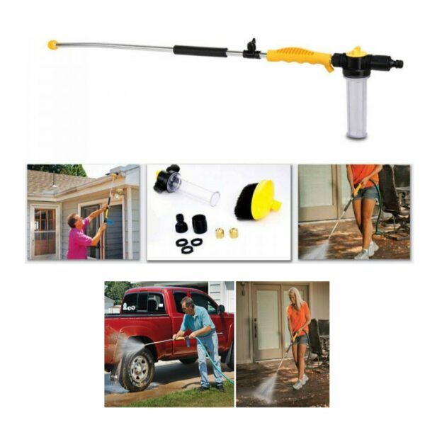 Πιεστικό πιστόλι νερού. Προσαρμόζεται στο ποτιστικό λάστιχο και σας βοηθά να καθαρίσετε τους εξωτερικούς χώρους του σπιτιού, της επιχείρησής σας ή του αυτοκινήτου σας. Καθαρίζει τις περιοχές που δεν φτάνετε εύκολα. Διαθέτει βούρτσα για τον καθαρισμό των τζαμιών. Διαθέτει δοχείο με δοσομετρητή για απορρυπαντικό για καλύτερα αποτελέσματα.