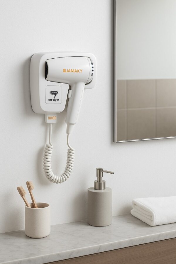 Πιστολάκι μαλλιών Jamaky με επιτοίχια εγκατάσταση, ειδικά σχεδιασμένο για ξενοδοχειακές μονάδες.