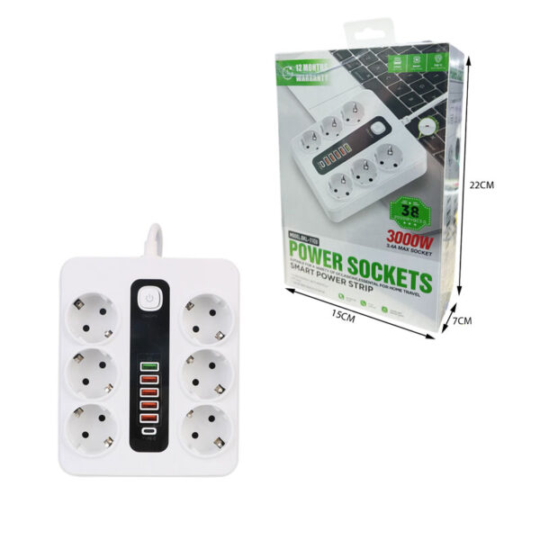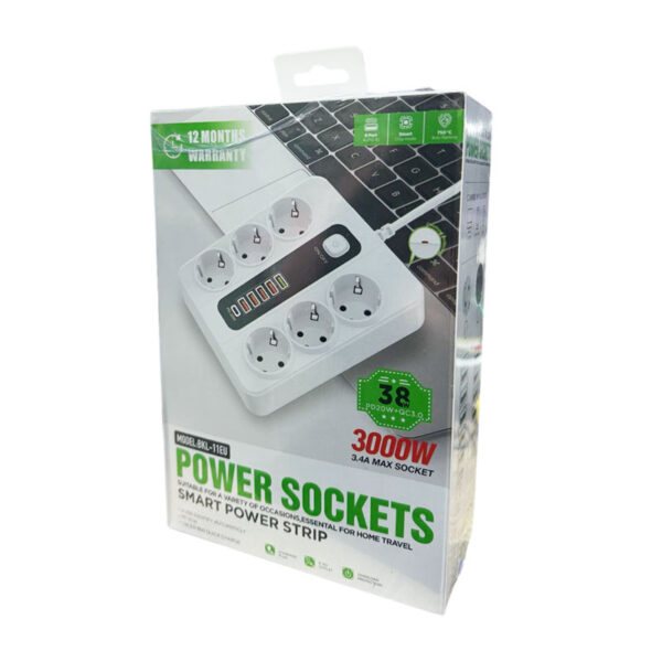 Πολύμπριζο 6 Θέσεων, 5USB και 1Type-C με διακόπτη 3000W BKL-11EU- Power Socket