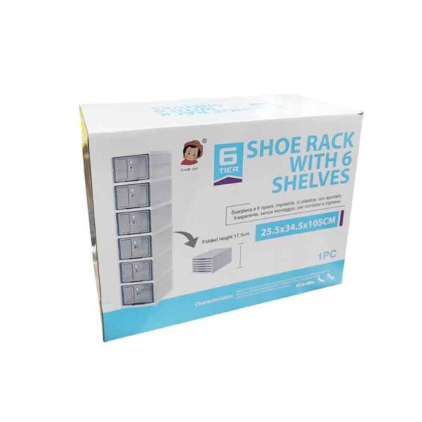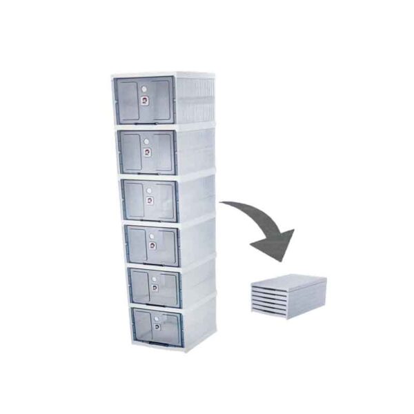 Πρακτική ραφιέρα παπουτσιών με 6 ξεχωριστές θέσεις/κουτιά, ιδανική για οργάνωση και αποθήκευση παπουτσιών στο σπίτι ή το γραφείο. Κατασκευασμένη από ανθεκτικό πλαστικό, με διάφανες πόρτες που ανοίγουν εύκολα για άμεση πρόσβαση. Τοποθετείται κάθετα για εξοικονόμηση χώρου και μπορεί να αποσυναρμολογηθεί για εύκολη αποθήκευση.