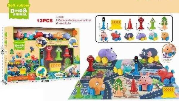 Σετ μοκέτα-αυτοκινητόδρομος με αμαξάκια-ζωάκια από μαλακή μη τοξική σιλικόνη για μέγιστη ανθεκτικότητα και ασφαλές παιχνίδι.