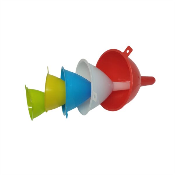 Σετ χωνιά κουζίνας. Κατάλληλο για καθημερινή χρήση. Μπορείτε εύκολα να μεταγγίζετε υγρά, χωρίς τον κίνδυνο διαρροών. Είναι κατασκευασμένο από ανθεκτικό πλαστικό, κατάλληλο για επαφή με τρόφιμα. Η συσκευασία περιλαμβάνει 5 χωνιά με διαφορετικά μεγέθη και χρώματα.