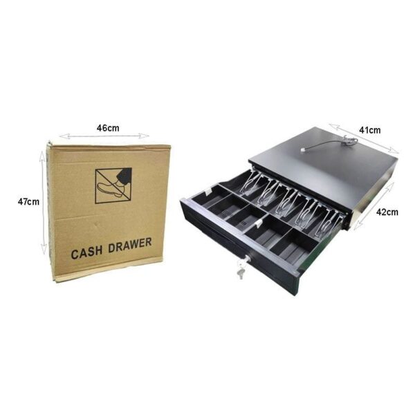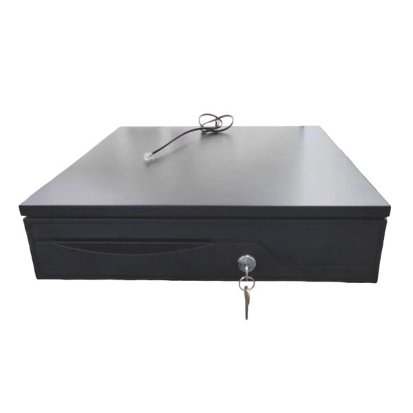 Μεταλλικό συρτάρι ταμειακής μηχανής με ανθεκτική κατασκευή και μηχανισμό αυτόματου ανοίγματος.